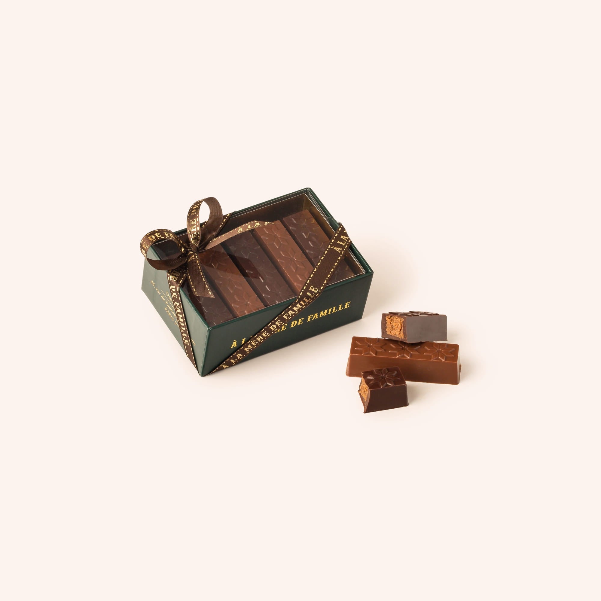 Fine chocolate bars with fine almond hazelnut praline combined with a fleur de sel hazelnut praline. A unique treat to devour! The box consists of 6 bars coated in 65% dark chocolate and 4 bars coated in milk chocolate.