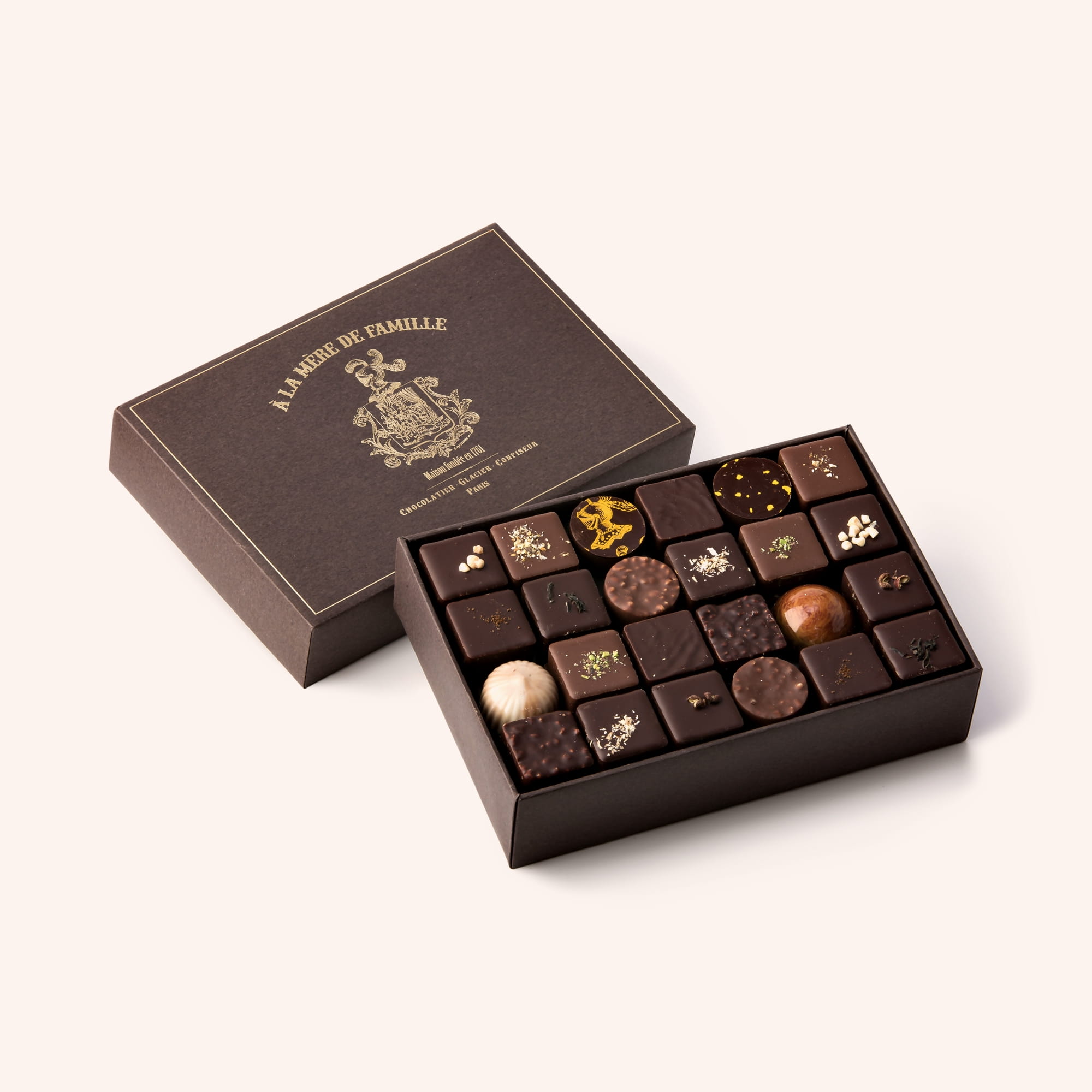 Notre coffret est composé de 46 bonbons de chocolats répartis sur deux niveaux. L’assortiment peut varier mais ne contient jamais de bonbons à l’alcool ni de ganaches fruitées.