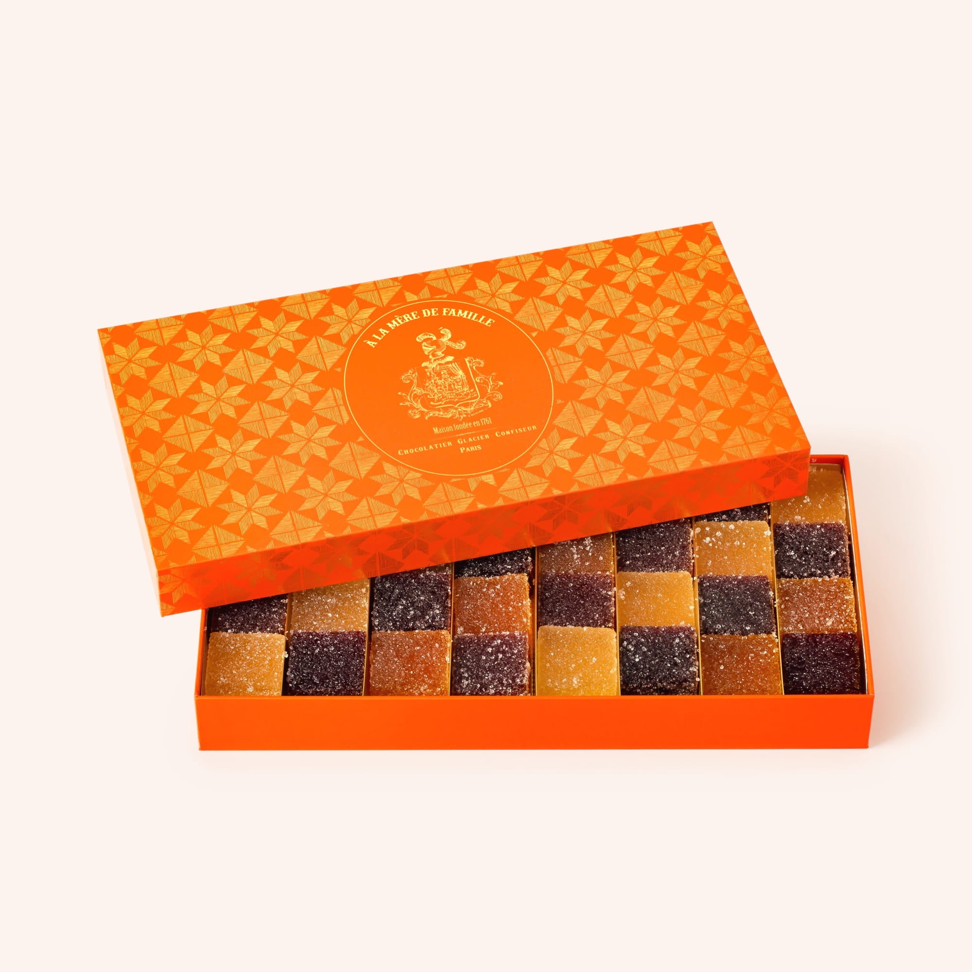 Suivant un procédé de fabrication traditionnel et grâce à une cuisson qui libère leur parfum, elles révèlent leur goût authentique et le sucre cristallisé qui les enrobe les rend si attrayantes ! Abricot, ananas, cassis, cerise, citron vert, fraise, framboise, mangue, pêche de vigne, clémentine corse… c’est un arc-en-ciel de couleurs et une palette de saveurs que vous retrouverez dans ce coffret de pâtes de fruits 100 % naturelles.