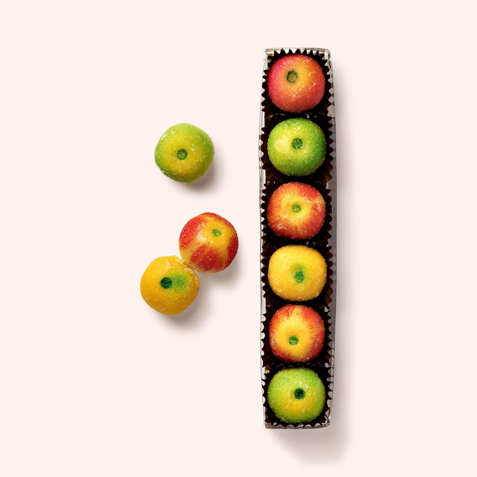 Ces petites pommes en pâte d’amandes vous rendront vite accro ! Préparées à partir d’une pâte d’amandes peu sucrée, plus riche en amandes, elles sont recouvertes d’une fine pellicule de sucre candi qui protège leur incomparable moelleux…