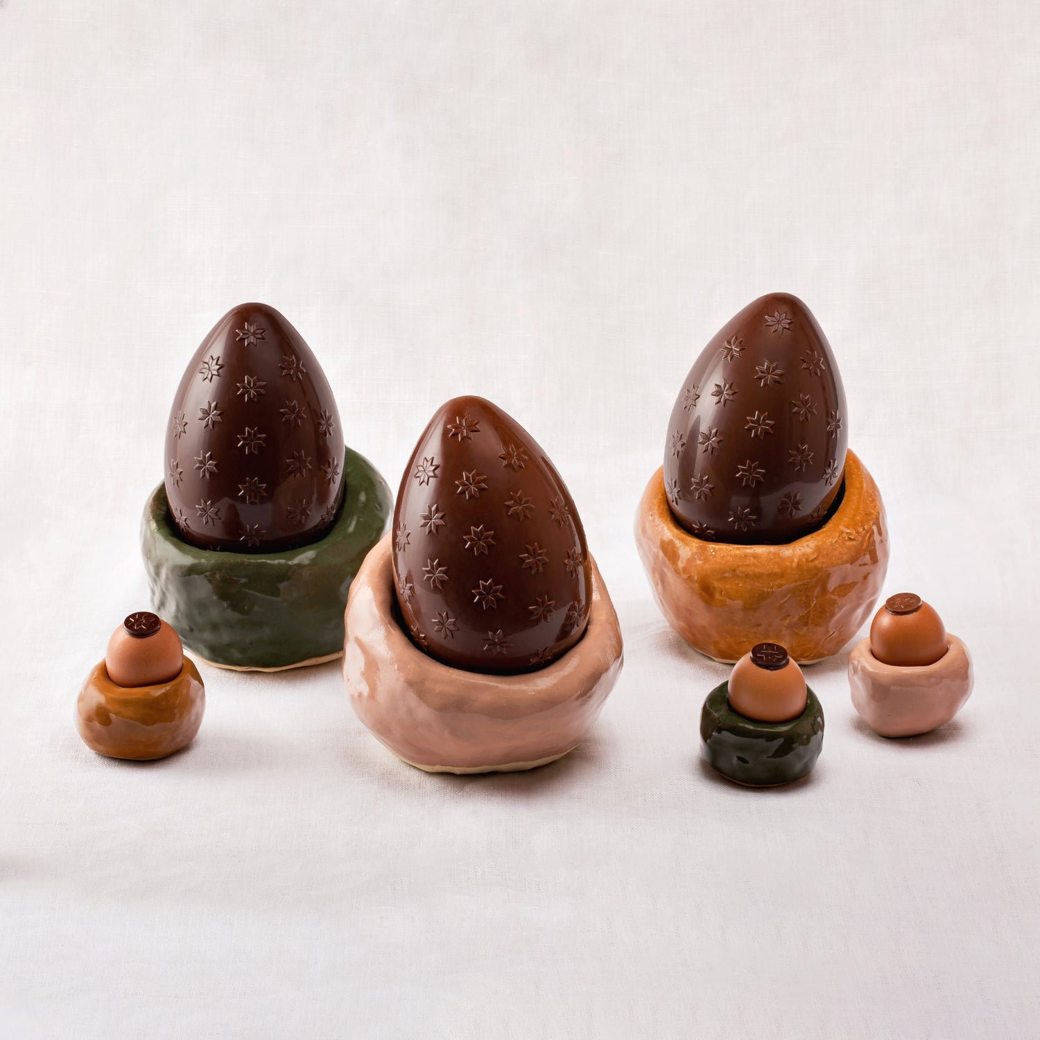 L’alliance de leur savoir-faire et leur rapport aux gestes de la confection artisanale d’une pièce en grès ou en chocolat ont ainsi vu éclore une collection de coquetiers de Pâques, véritables objets fonctionnels et décoratifs : nids de poule en vue !
