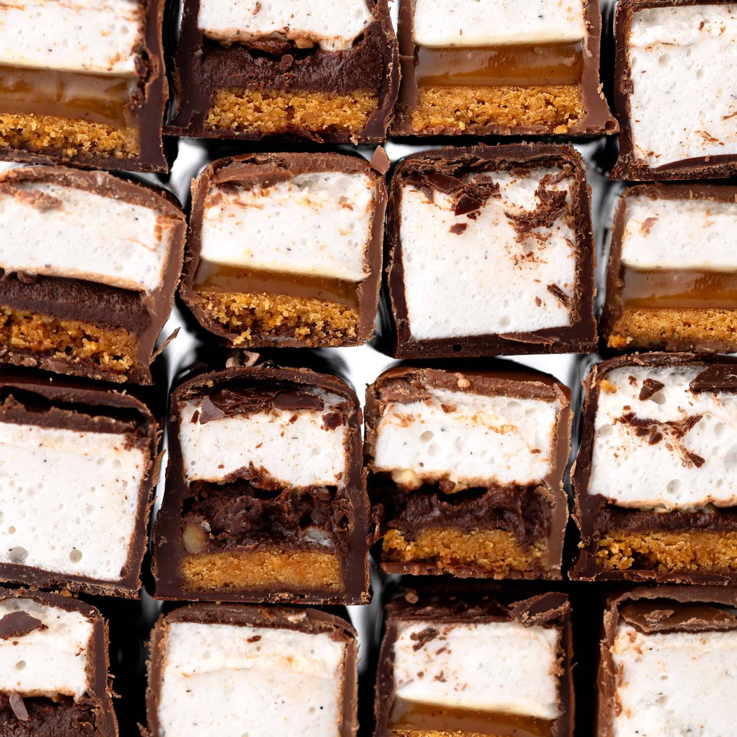 - Guimauve vanille, pâte à tartiner, éclats de noisettes, biscuit, enrobée de chocolat noir ou de chocolat au lait (décor grué de cacao)