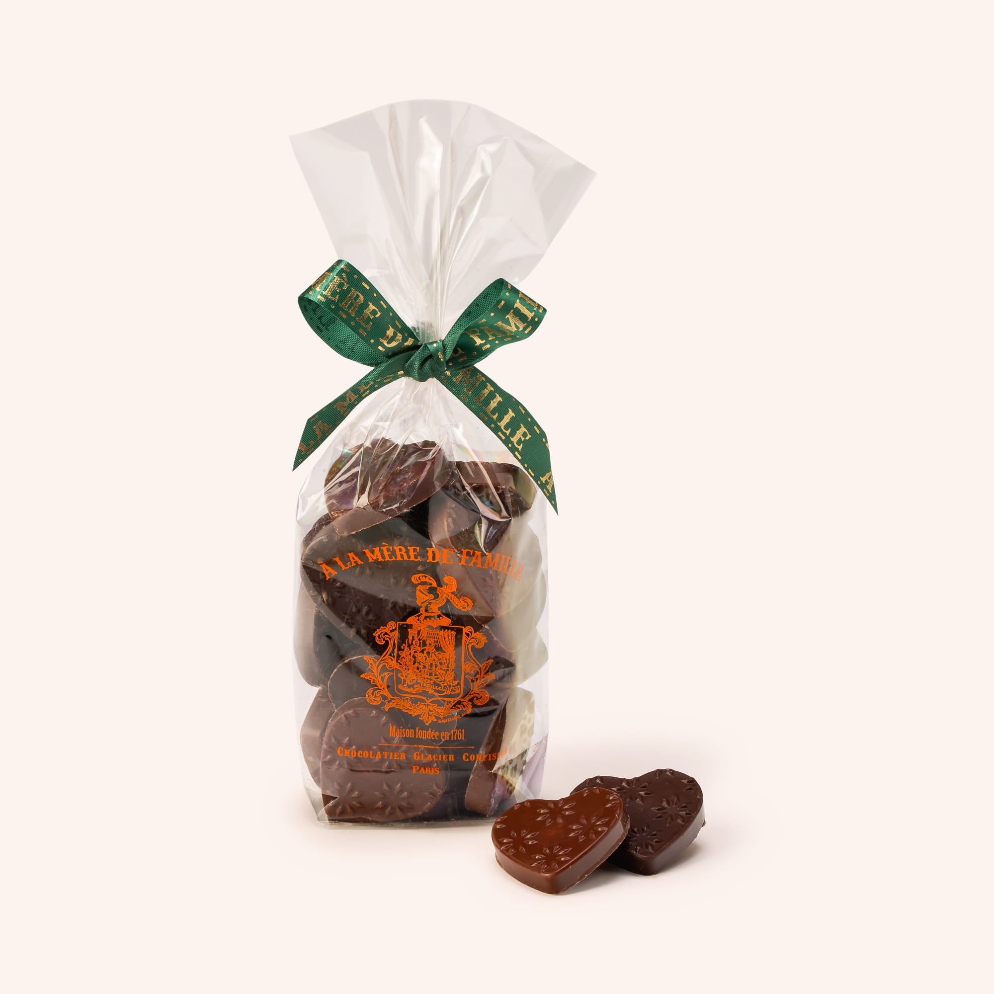 Pour sa fête ou pour son anniversaire, régalez votre mère avec ce sachet de petits cœurs assortis et ultra gourmands. Au chocolat au lait ou chocolat noir signature, ces coeurs d’amour sont fourrés de notre praliné iconique. Cette célèbre recette de la Maison est élaborée selon des techniques ancestrales où amande et noisette de Sicile sont torréfiées puis caramélisées avant un broyage à froid qui sublime toutes les saveurs de cet heureux mariage entre cacao, beurre de cacao, caramel et fruits secs. Vous verrez, une fois qu’on y a goûté… Difficile de sortir la main du sachet !