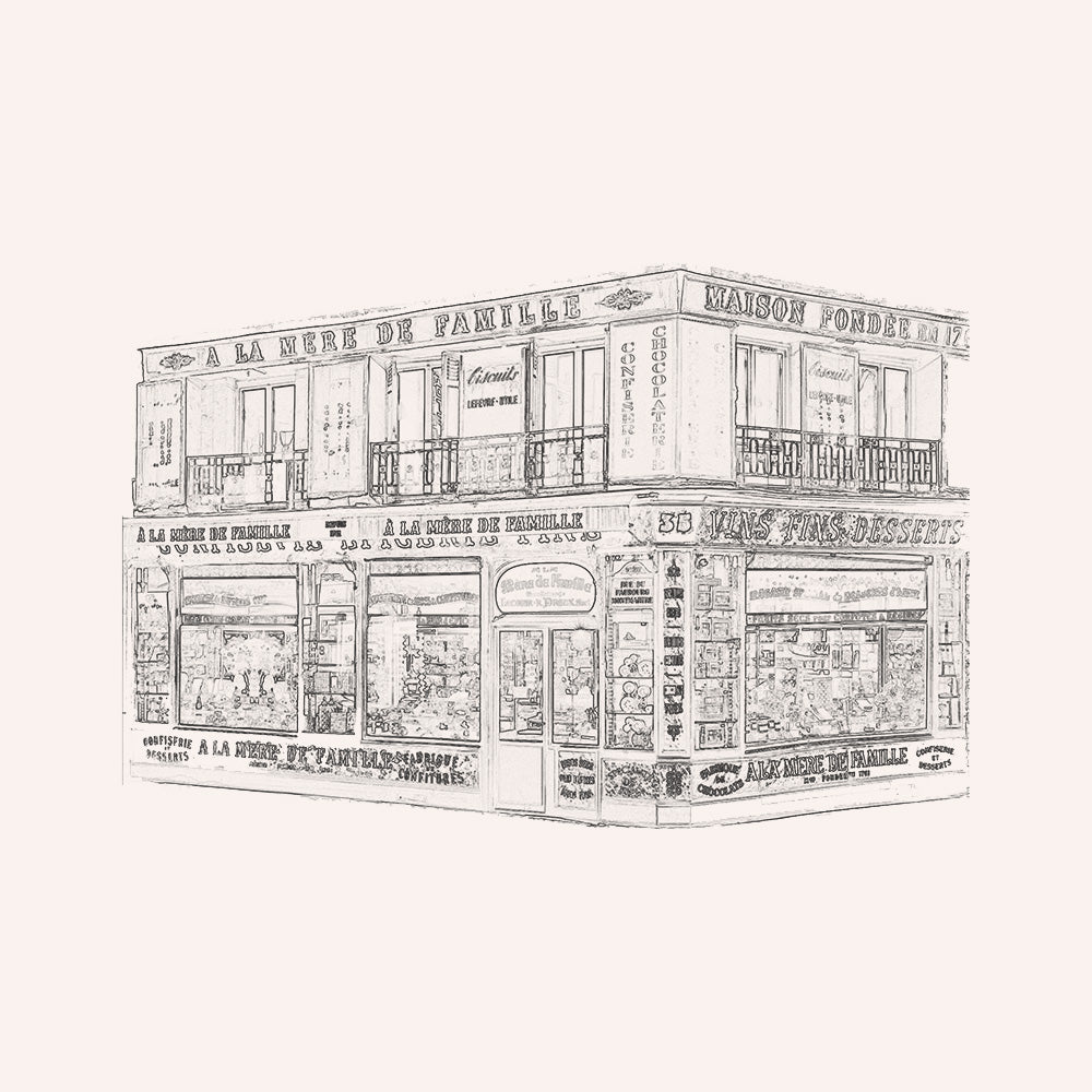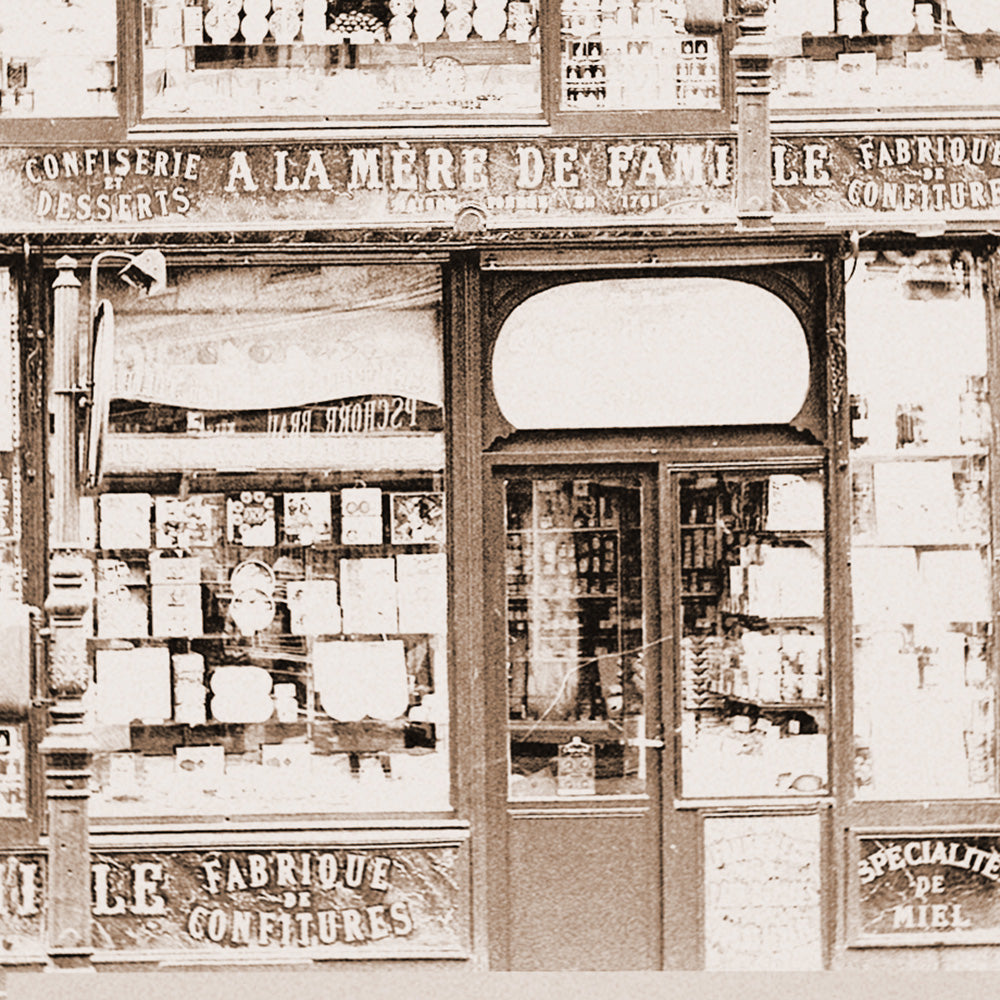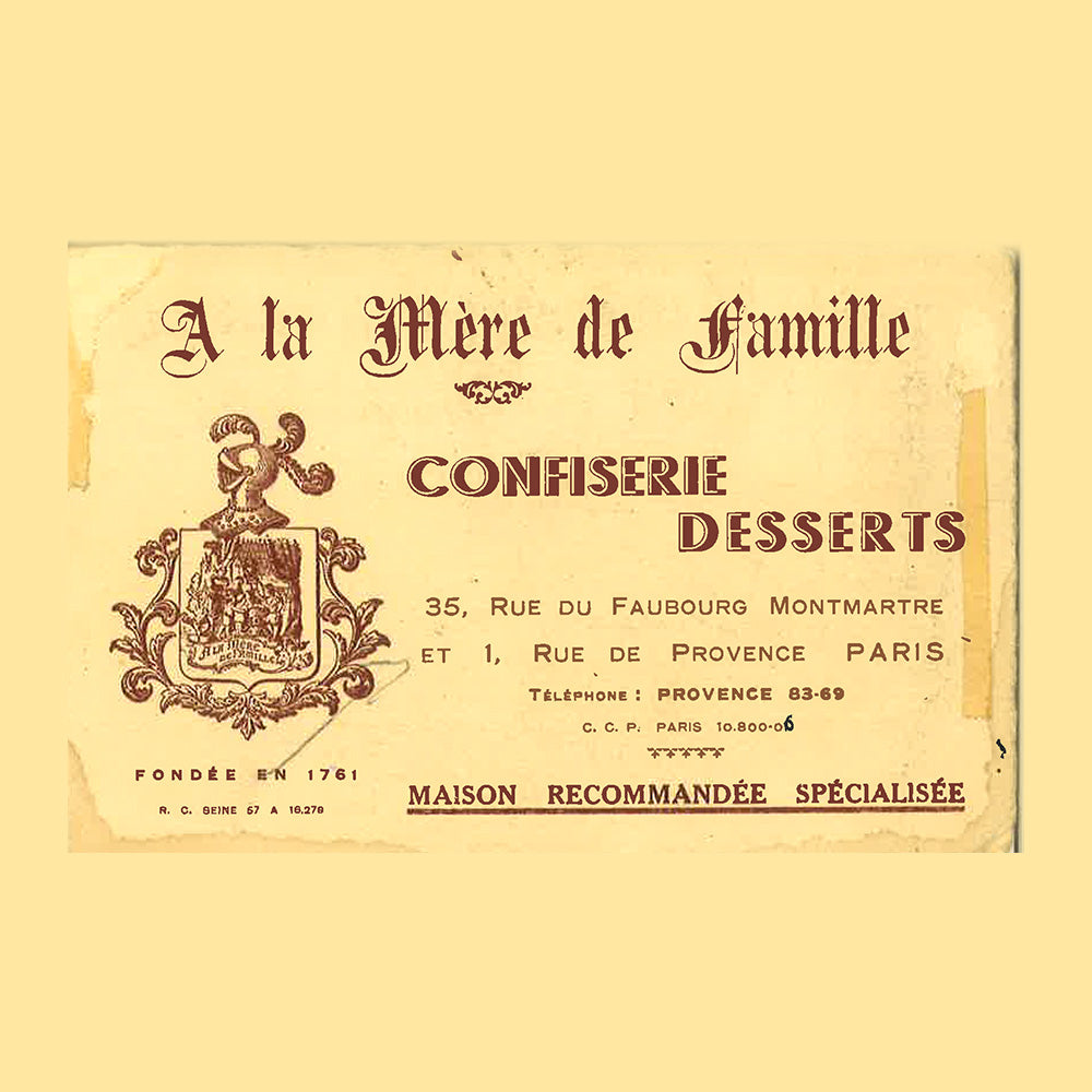 Founded in 1761 on rue du Faubourg Montmartre by a young grocer from Coulommiers, the address became that of the " Mère de Famille " when it was taken over by Marie-Adélaïde Bridault at the very beginning of the 19th century. Second wife of one of Pierre-Jean Bernard's sons-in-law, who took over the business after her husband's death in 1807 and left alone with her four children, she brought the shop unprecedented fame.