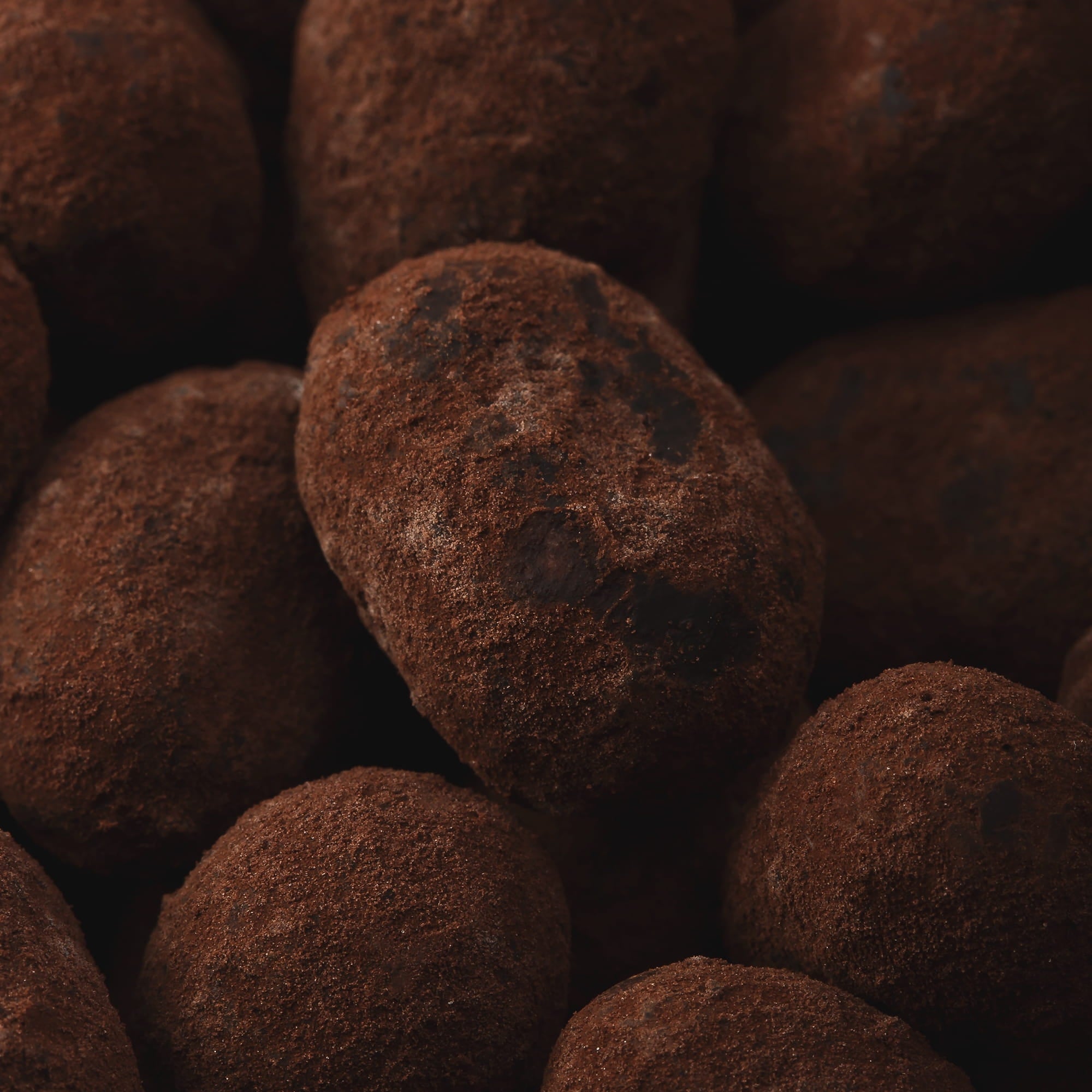 Caramelized almonds and hazelnut praline coated in dark chocolate then dusted with cocoa powder.