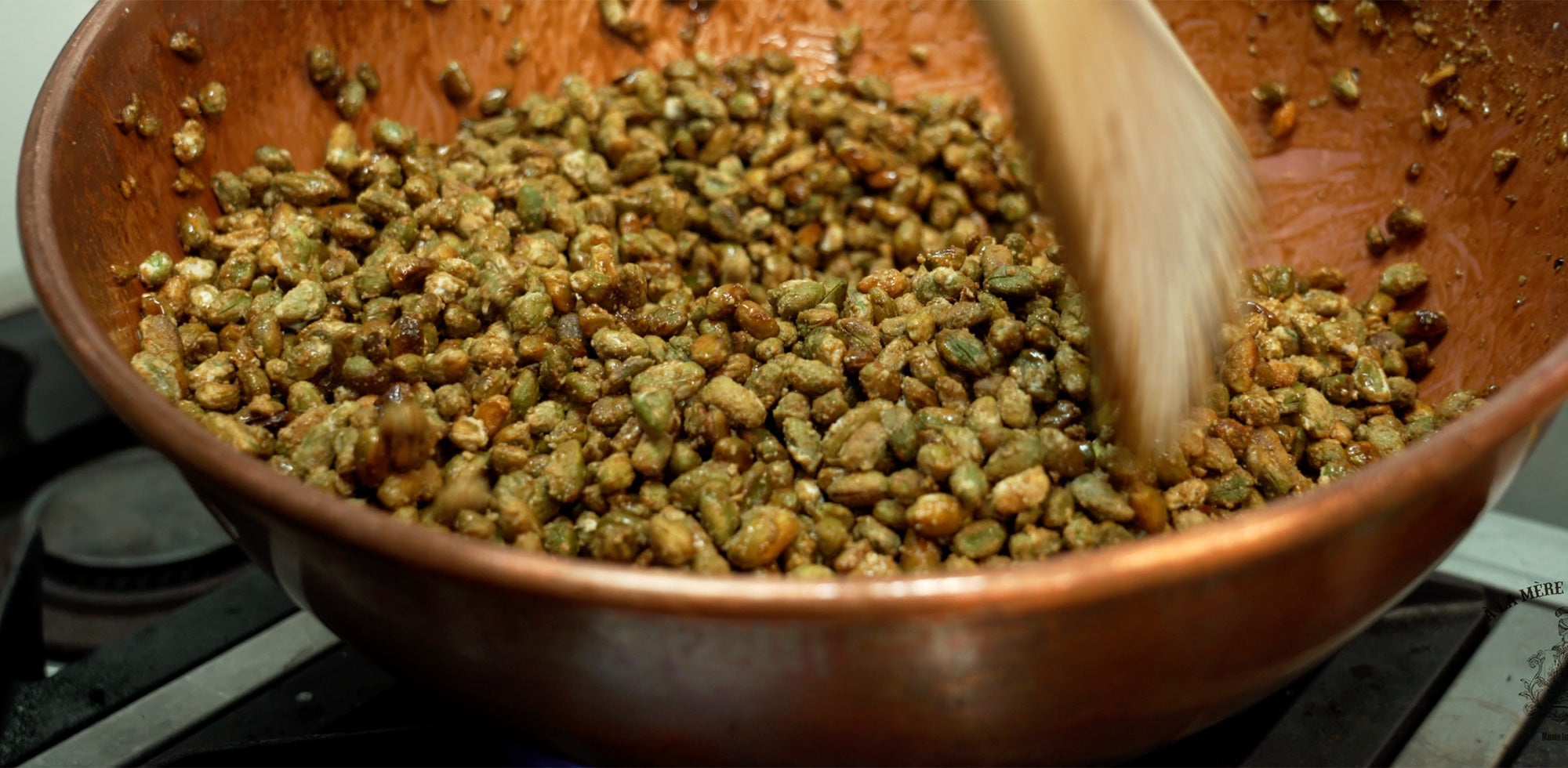 Chaque jour, cakes aux fruits confits, aux folies de l’écureuil ou au citron, viennent enrichir l’étal des boutiques. Un délice mis au point pendant de longs mois par la famille et son chef. Savoureux et moelleux, ils sont fabriqués Maison et tutoient les macarons, eux aussi confectionnés et imaginés par À la Mère de Famille. Pistaches, noisettes et pignons, finement sélectionnés, s’invitent jusque dans la coque, rustique et craquelée, où leurs arômes s’imposent aussi intacts que puissants. À l’intérieur, une ganache fine et onctueuse sublime la saveur authentique de chaque fruit sec. Chocolat, pistache, noisette, pignon de pin, café, vanille ou caramel salé, il y en a pour tous les goûts. Avec eux, impossible de tourner en (maca)ron(d).