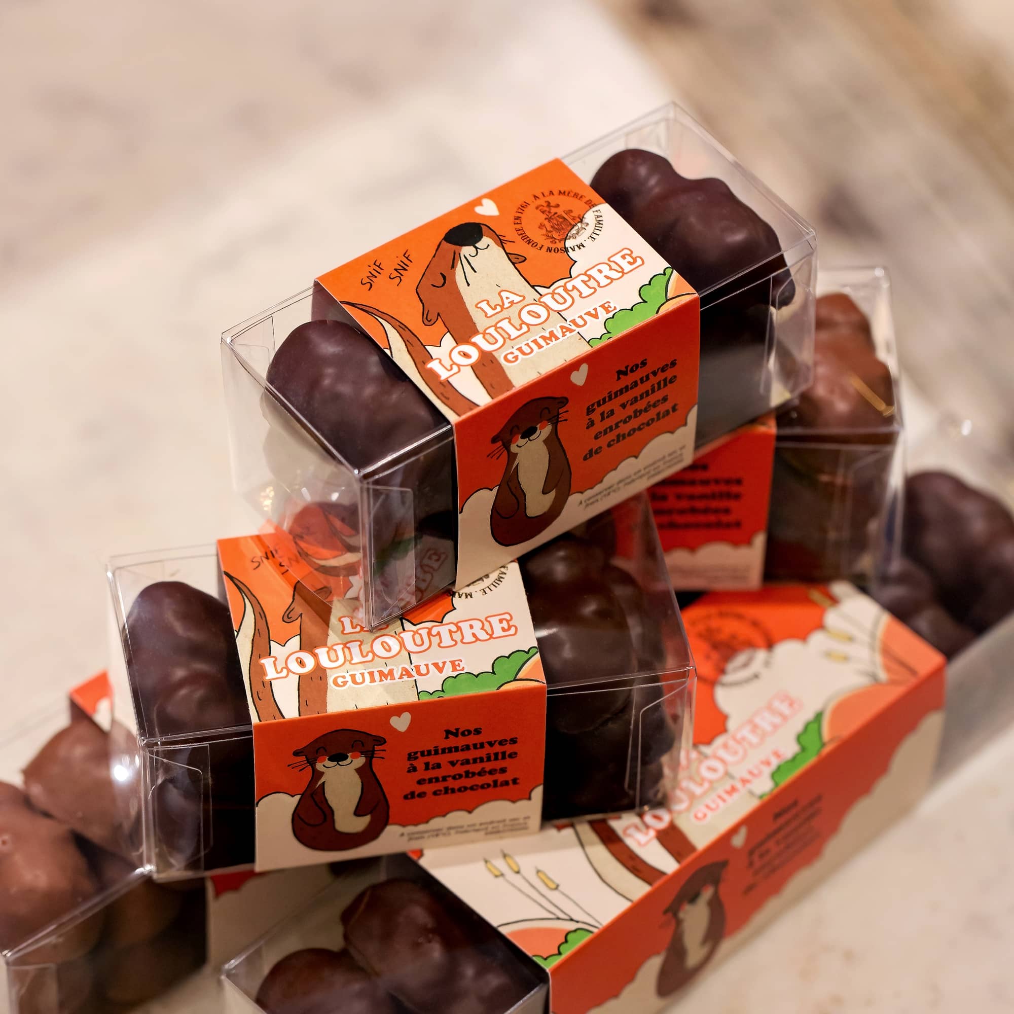 Sous sa généreuse coque de chocolat au lait aussi savoureuse que craquante, notre louloutre guimauve à la vanille est ultra légère et follement moelleuse.